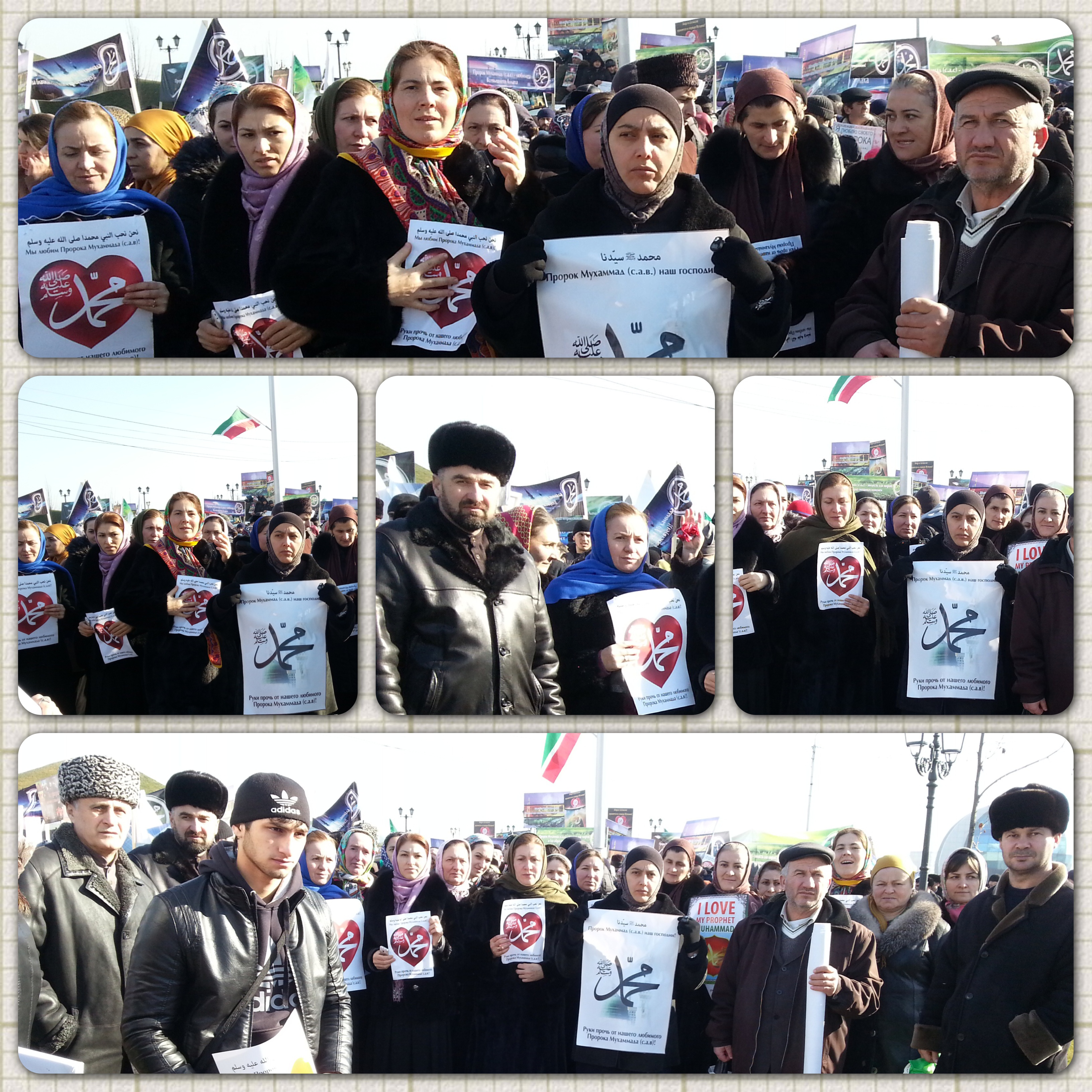 20.01.2015Глава Чечни Рамзан Ахматович Кадыров на митинге в защиту исламских ценностей в Грозном 19 января 2015 года заявил:"Мы с вами на весь мир заявляем, что мусульмане ни в коем случае не позволят использовать себя для раскачивания ситуации в стране. Мы всегда были надежными защитниками России! И сегодня в состоянии дать достойный отпор любым врагам нашего Отечества! Ислам является религией мира и созидания! Он учит жить в мире и согласии со всеми народами нашей страны, с людьми разных вероисповеданий. Мы строго соблюдаем эти принципы, заложенные в Священном Коране и Сунне Посланника Аллаха", — заявил Кадыров.Манифестация перед мэрией Грозного проходила под лозунгами "Нет карикатурам на пророка Мухаммеда", "Ислам — религия добра и созидания". Для участия в митинге верующие приехали со всего Кавказа.