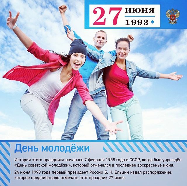 27.06.2016История этого праздника началась 7 февраля 1958 года в СССР, когда был учреждён "День советской молодёжи", который отмечался в последнее воскресенье июня. 24 июня 1993 года первый президент России Б.Н.Ельцин издал распоряжение, которое предписывало отмечать этот праздник 27 июня.