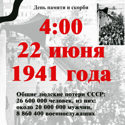 22.06.201622 июня - день памяти и скорби — день начала Великой Отечественной войны (1941 год) - одна из самых печальных дат в истории России... "Вставай, страна огромная, Вставай на смертный бой С фашистской силой темною, С проклятою ордой!" © Calend.ru