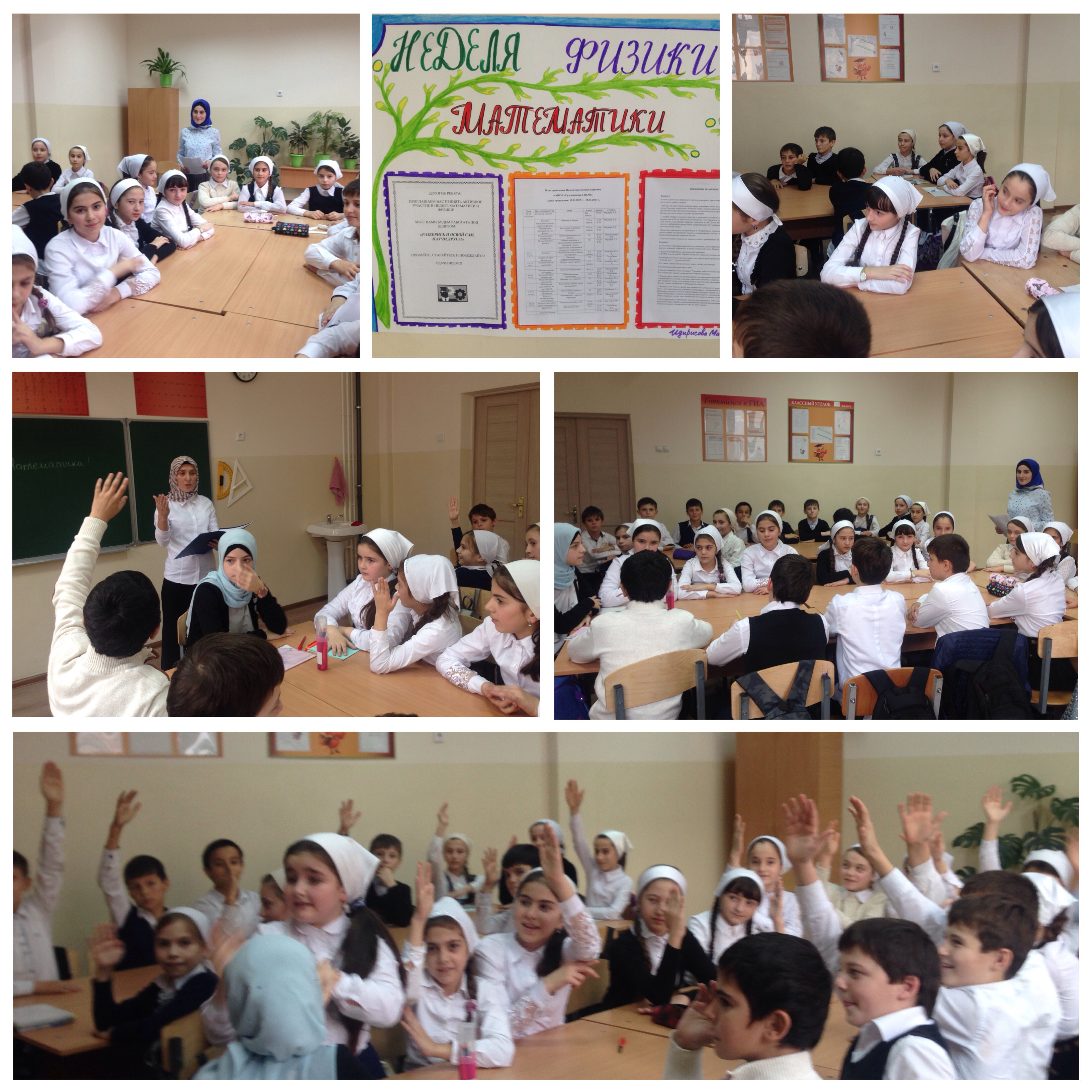 14.11.2017В школе стартовала Неделя математики и физики. План Недели включает различные конкурсы, викторины, брейн-ринги, КВН. Учителя-предметники дадут открытые уроки и проведут внеклассные мероприятия. Учитель математики Хусайнова Э.С-М. порадовала интересным внеклассным мероприятием "Веселая математика", в котором принял участие 5Г класс. Ребята решали нестандартные задачи на логику и смекалку, отгадывали загадки и рисовали волшебные образы геометрических фигур. Мероприятие носило интегративный характер, а провести его помогла учитель биологии Янсукова Х.Р. Молодцы!