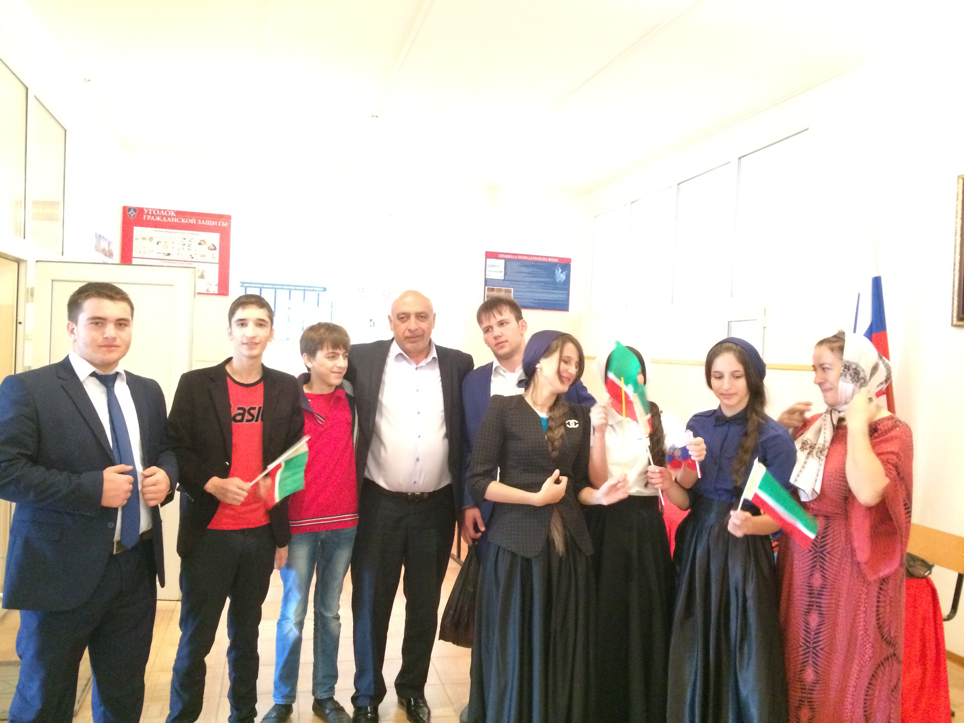 06.09.2015С 5 по 6 сентября 2015 года в школе отмечался День Чеченской Республики.В рамках данного мероприятия, согласно внутришкольному плану были проведены:- классные часы и беседы в 9-11 классах по теме « День гражданского согласия, единения и примирения, в ходе беседы кл. руководители Солтаева Л.Х., Бачаева М.А., Алсултанова К.С. и Семиева Х.М. и др. ознакомили учащихся с историей возникновения данного праздника и его историческим значением для чеченского народа, были освещены поздравления в адрес чеченского народа Главы Чеченской Республики, Кадырова Р.А., а так же видных деятелей республики.-уроки истории прошли в5-8 классах, учителя истории Тахгериева З.К.; Мадагов В.А. рассказали о празднике республиканского значения, как он проходит в различных районах и городах нашей республики, с какими историческими событиями из жизни народа он связан. На уроках был использован материал (символика республики, портрет, плакаты, средства массовой информации и т.д.), рассказывающий о достижениях республики в сфере культуры, градостроительства, спорта, образования.